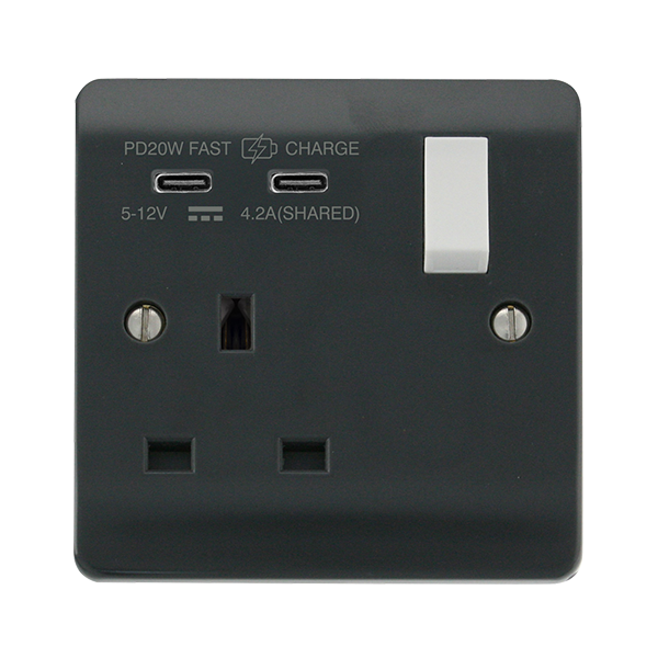 Range of visually contrasting wiring accessories, smooth profile in an anthracite grey finish to comply with current Building Regulations Part M.