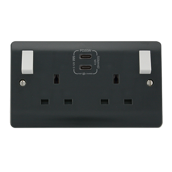 Range of visually contrasting wiring accessories, smooth profile in an anthracite grey finish to comply with current Building Regulations Part M.